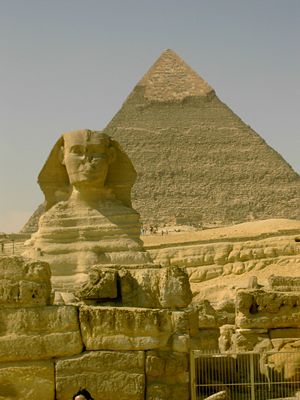 Sfingy: ležiace telo leva s ludskou hlavou, v Gíze je obrovská sfinga dlhá 70 m, vysoká 20 m, vytesaná z vápencového vršku.